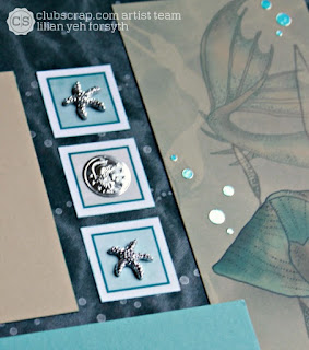 I used the other piece of the trimmed 8.5 x 11 printed paper on the right edge. I trimmed more Embellishment Cutaparts elements and embellished them with Lagoon Starfish Rhinestones and a Silver Coin.